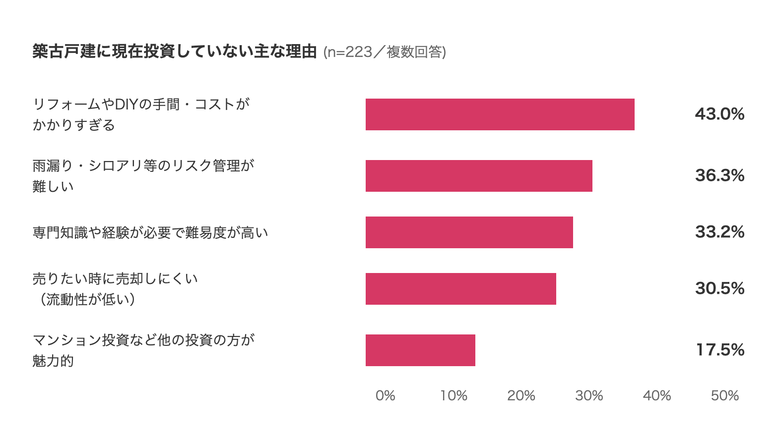 築古戸建に現在投資していない層に理由を尋ねたところ、「リフォームやDIYの手間・コストがかかりすぎる」43.0%が最多となりました。