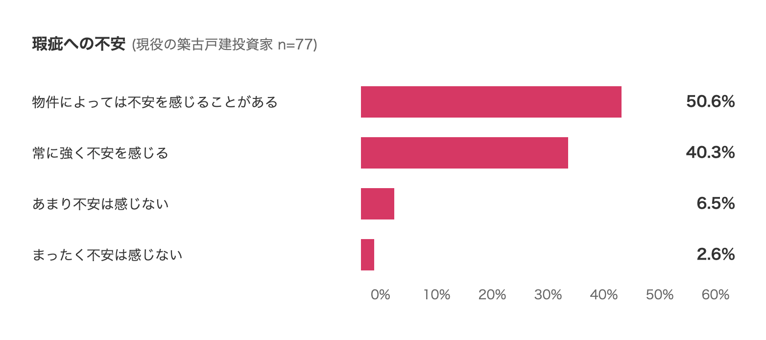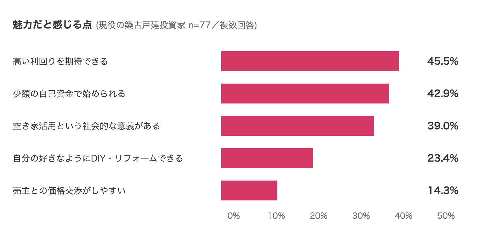なお、本リリースで「現役の築古戸建投資家」と表記する場合は、アンケート上「現在、投資・所有している」と回答した層(n=77)を指します。