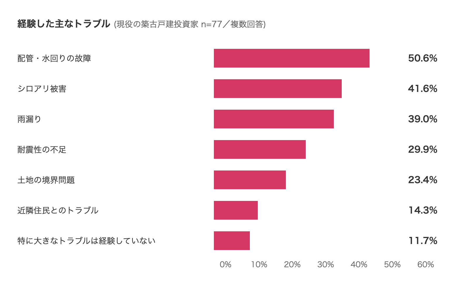 現役の築古戸建投資家(n=77)の50.6%が「配管・水回りの故障」を経験しており、雨漏り(39.0%)・シロアリ被害(41.6%)も高い水準でした。